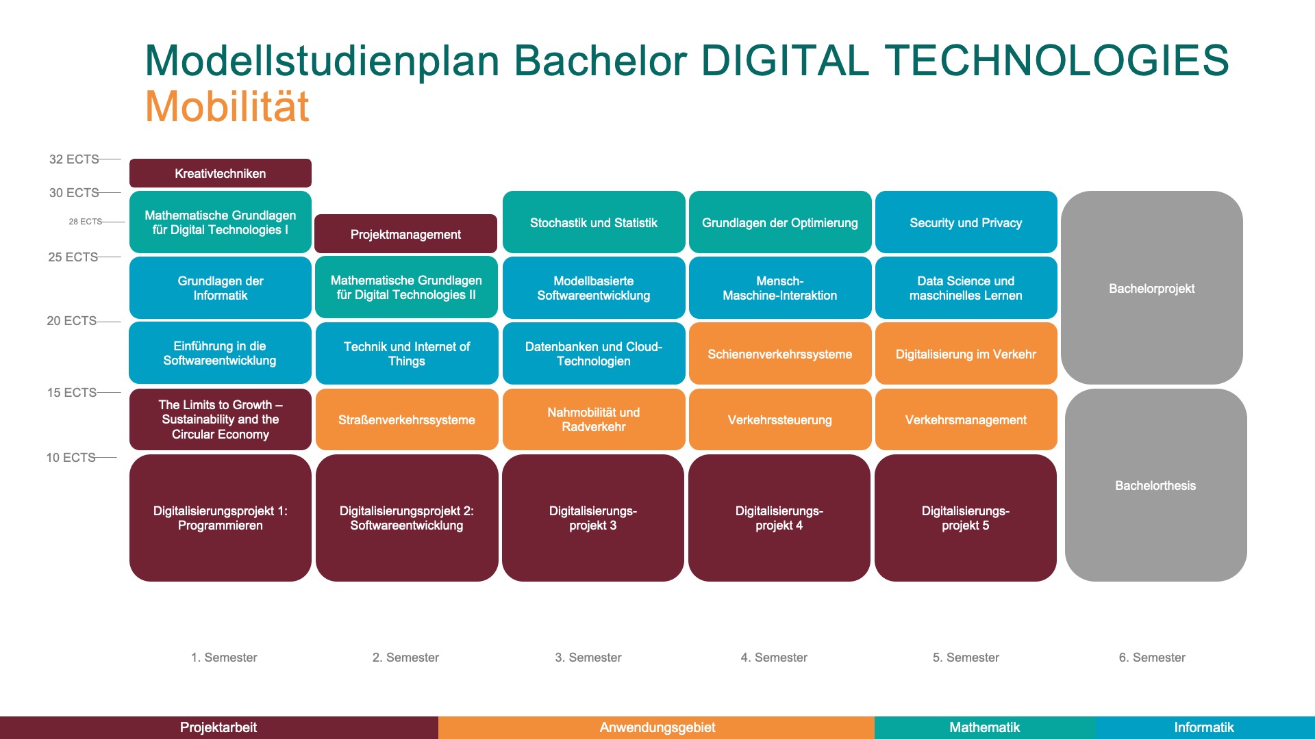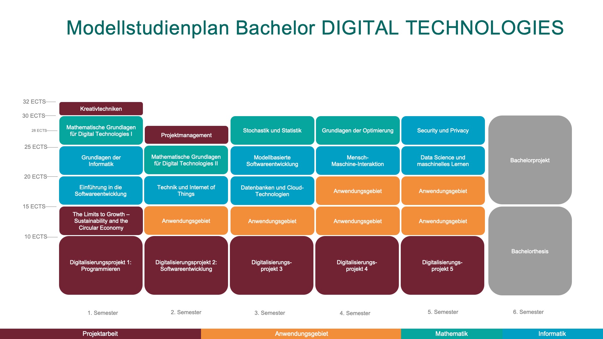 Der Bachelorstudiengang Digital Technologies ist so aufgebaut, dass du Theorie und Praxis optimal miteinander verbinden kannst. Hier siehst du einen typischen Studienplan, der zeigt, wie Module und Projekte organisiert sind.